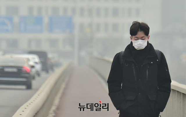 고농도 미세먼지로 비상저감조치가 시행된 14일 오후 서울 여의도 서강대교를 시민들이 마스크를 쓰고 건너고 있다. 이날 서울 미세먼지와 초미세먼지는 '매우 나쁨' 수준을 보이고 있다.