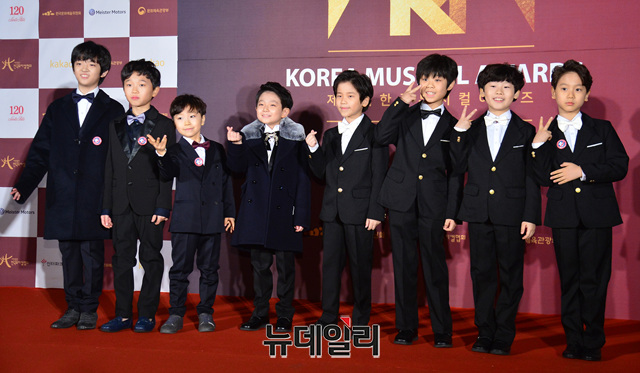 EMK 아역배우들이 14일 오후 서울 용산구 블루스퀘어에서 '제3회 한국뮤지컬어워즈(KOREA MUSICAL AWARDS)' 레드카펫 행사에 참석해 포토타임을 갖고 있다.