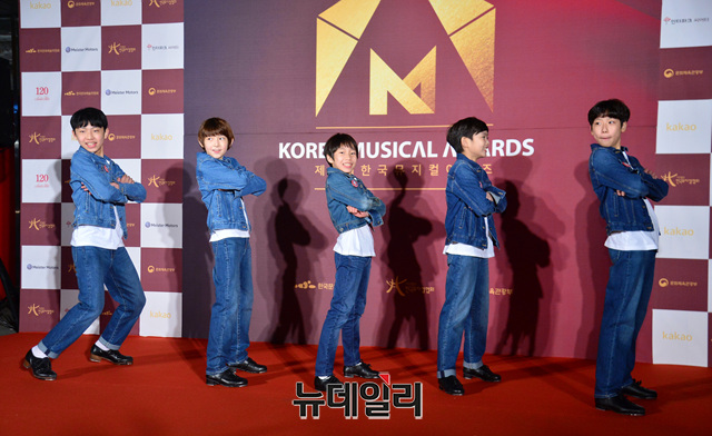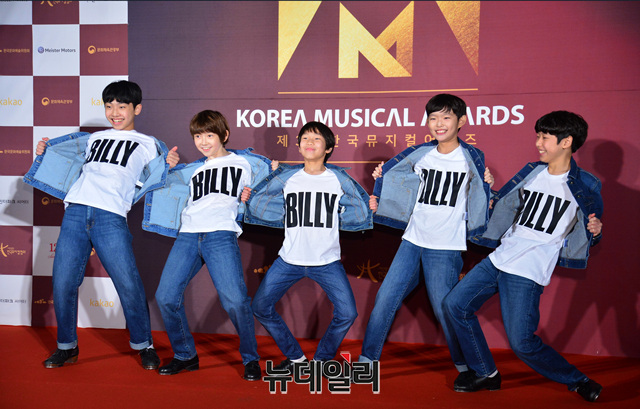 뮤지컬 '빌리 엘리어트' 아역배우들이 14일 오후 서울 용산구 블루스퀘어에서 '제3회 한국뮤지컬어워즈(KOREA MUSICAL AWARDS)' 레드카펫 행사에 참석해 포토타임을 갖고 있다.