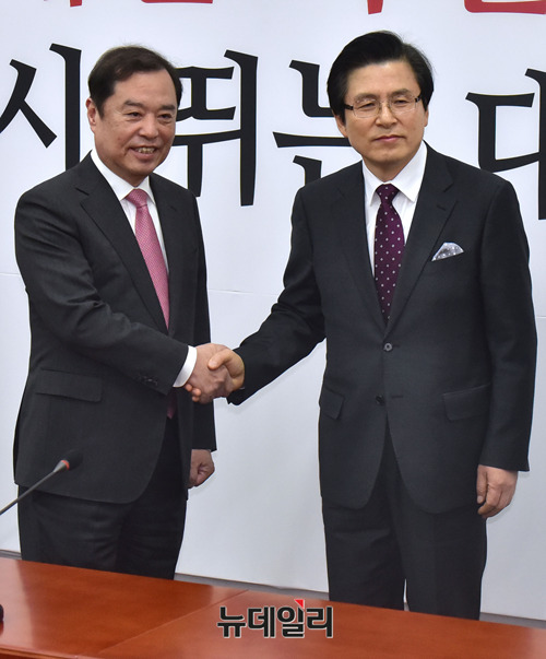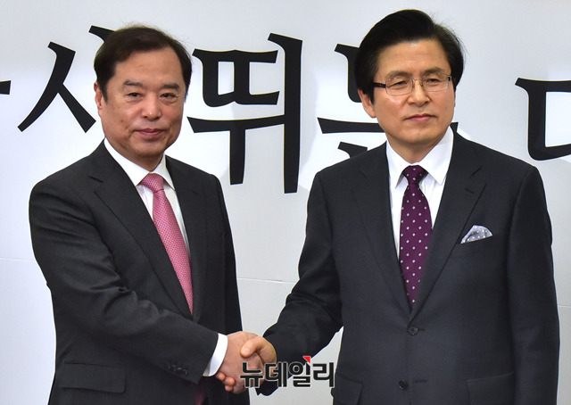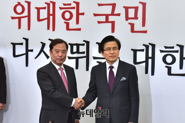황교안 전 국무총리가 15일 오전 국회에서 자유한국당 입당원서를 제출한 후 김병준 비대위원장과 기념사진을 촬영하고 있다.