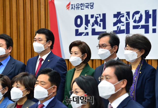 나경원 자유한국당 원내대표 및 의원들이 15일 오전 국회에서 열린 자유한국당 원내대책위-안전안심365 특별위원회 연석회의에 참석해 마스크를 쓴 채로 기념촬영을 하고 있다.
