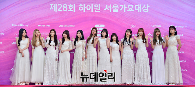 걸그룹 아이즈원이 15일 오후 서울 구로구 고척스카이돔에서 열린 ‘제28회 하이원 서울가요대상(SEOUL MUSIC AWARDS)’ 레드카펫 행사에서 포토타임을 갖고 있다.