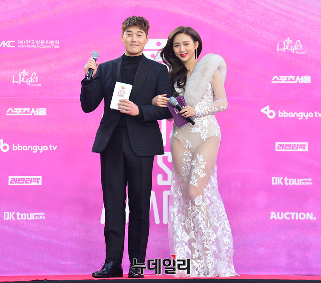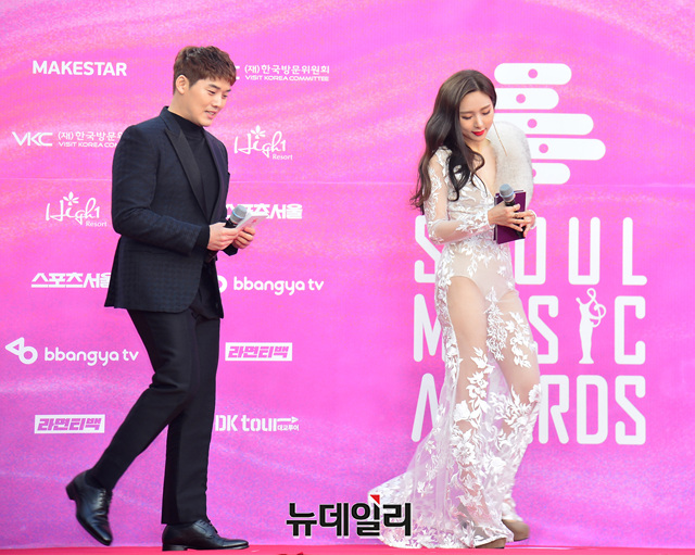 방송인 권혁수와 그룹 카밀라 한초임이 15일 오후 서울 구로구 고척스카이돔에서 열린 ‘제28회 하이원 서울가요대상(SEOUL MUSIC AWARDS)’ 레드카펫 행사에서 진행을 맡았다.