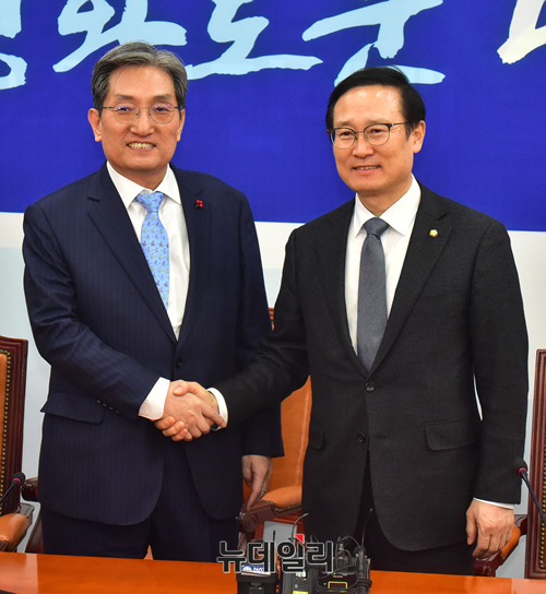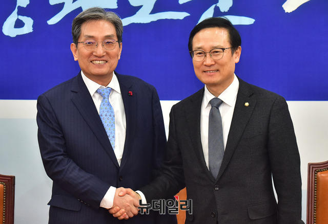 노영민 대통령비서실장이 16일 오후 국회에서 홍영표 더불어민주당 원내대표를 예방해 인사를 나누고 있다.