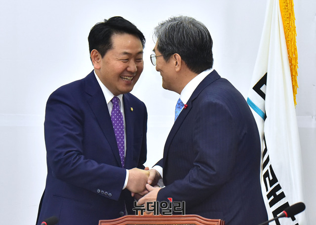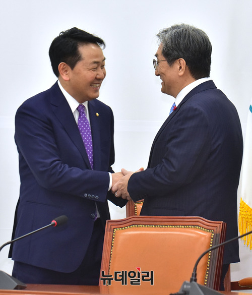 노영민 대통령비서실장이 16일 오후 국회에서 김관영 바른미래당 원내대표를 예방해 인사를 나누고 있다.