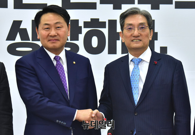 노영민 대통령비서실장이 16일 오후 국회에서 김관영 바른미래당 원내대표를 예방해 기념사진을 찍고 있다.
