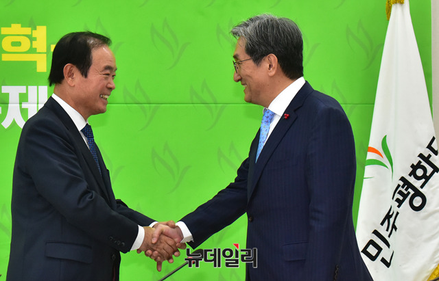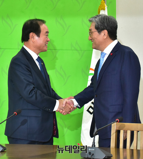노영민 대통령비서실장이 16일 오후 국회에서 장병완 민주평화당 원내대표를 예방해 인사를 나누고 있다.