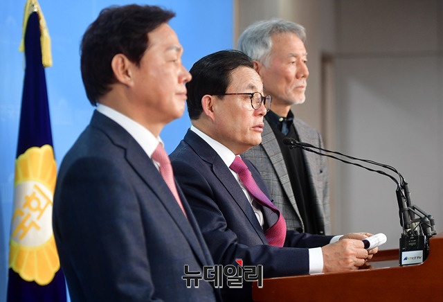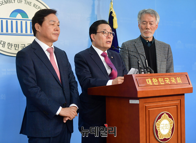 이채익 국회 행정안전위원회 자유한국당 간사와 박완수(왼쪽), 유민봉 위원이 17일 오후 국회 정론관에서 조해주 중앙선관위 상임위원 임명과 관련해 기자회견을 갖고 있다.
