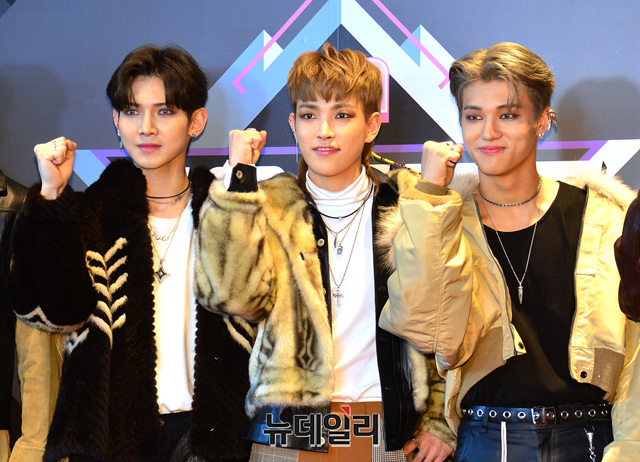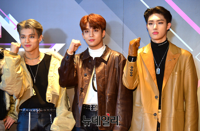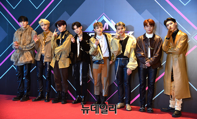 아이돌그룹 에이티즈가 17일 오후 서울 마포구 CJ E&M센터에서 열리는 엠카운트다운 생방송에 입장하며 포토타임을 갖고 있다.
