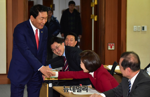 안상수 자유한국당 전국위원회 의장이 17일 오후 서울 여의도 중소기업중앙회에서 열린 제5차 상임전국위원회에 입장하며 나경원 원내대표와 악수를 나누고 있다.