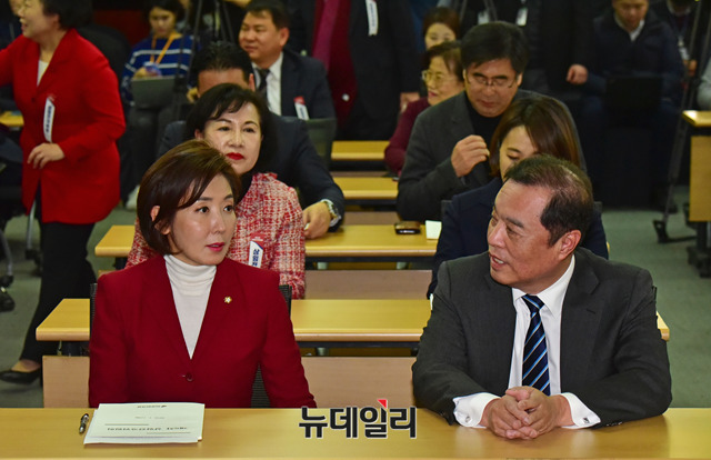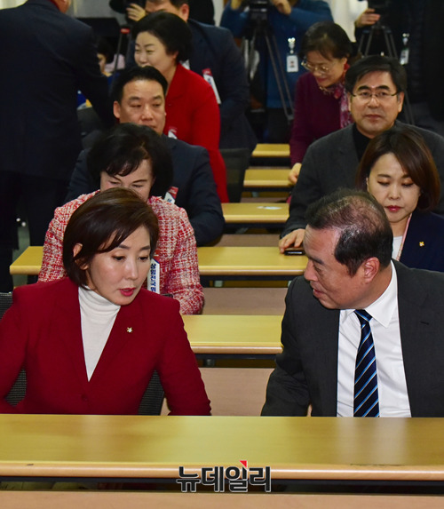 김병준 자유한국당 비대위원장과 나경원 원내대표가 17일 오후 서울 여의도 중소기업중앙회에서 열린 제5차 상임전국위원회에서 대화를 나누고 있다.