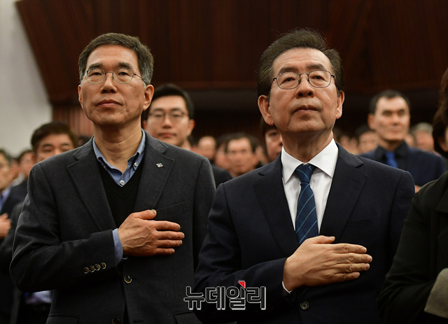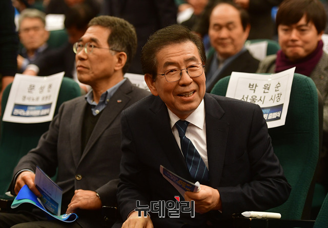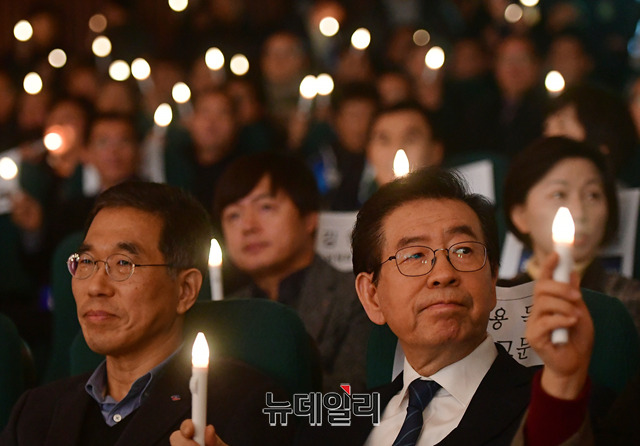 박원순 서울시장과 김주영 한국노총 위원장이 17일 오후 국회도서관 대강당에서 열린 전국노동위원회 출범식에 참석해 촛불을 흔들며 퍼포먼스를 하고 있다.