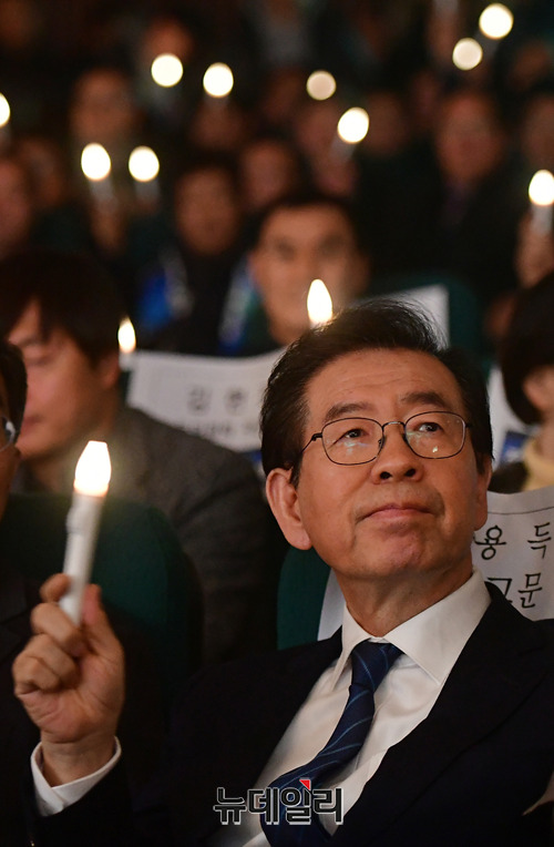 [포토] 전국노동위원회 출범식서 촛불 흔드는 박원순-김주영