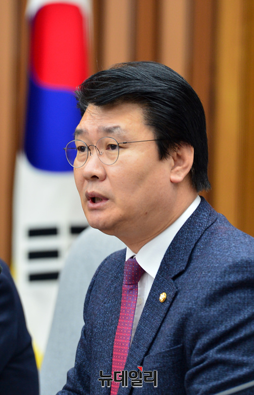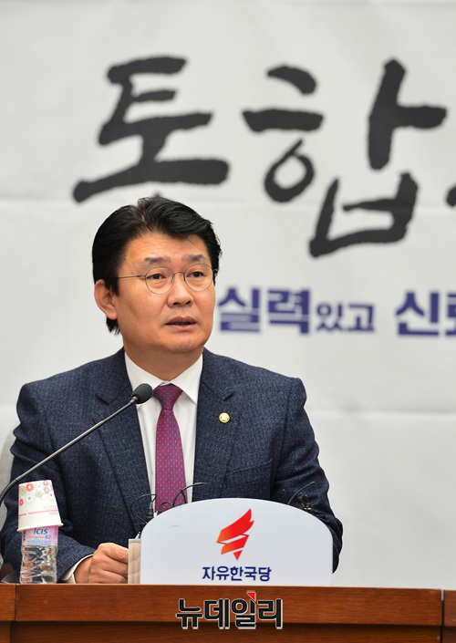 정용기 자유한국당 정책위의장이 18일 오전 국회에서 열린 원내대책회의에서 모두발언을 하고 있다.