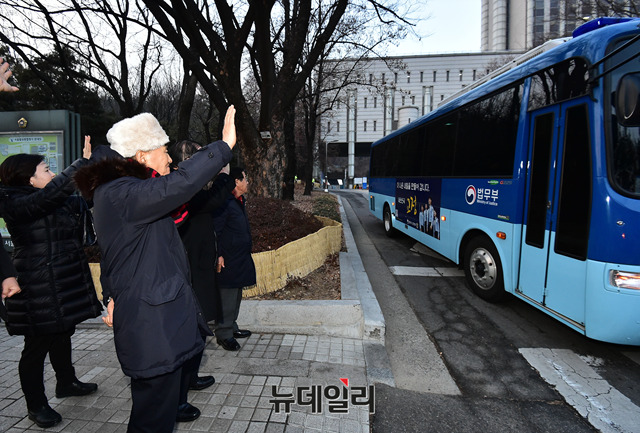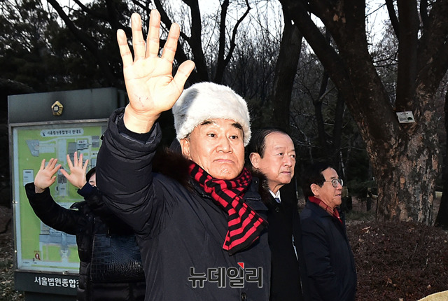 이재오 자유한국당 상임고문 등 이명박 전 대통령 측근들이 18일 오후 서울 서초구 서울고등법원에서 열린 항소심 속행공판을 마치고 구치소로 돌아가는 이 전 대통령 호송차를 향해 손을 흔들고 있다.
