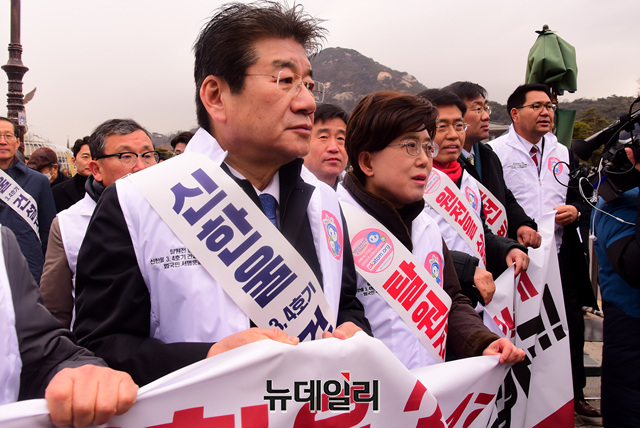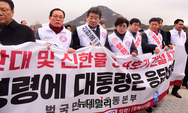 최연혜, 강석호 자유한국당 의원과 참석자들이 탈원전 반대와 신한울 3,4호기 건설 재개를 주장하며 21일 오전 청와대 앞 분수대에서 행진을 하고 있다.
