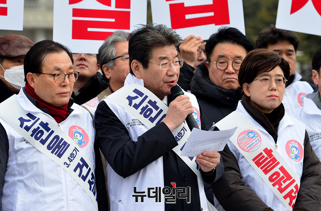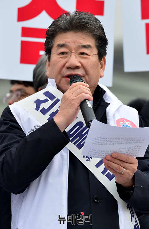 강석호 자유한국당 의원이 21일 오전 청와대 앞 분수대에서 탈원전 반대와 신한울 3,4호기 건설 재개를 주장하고 있다.