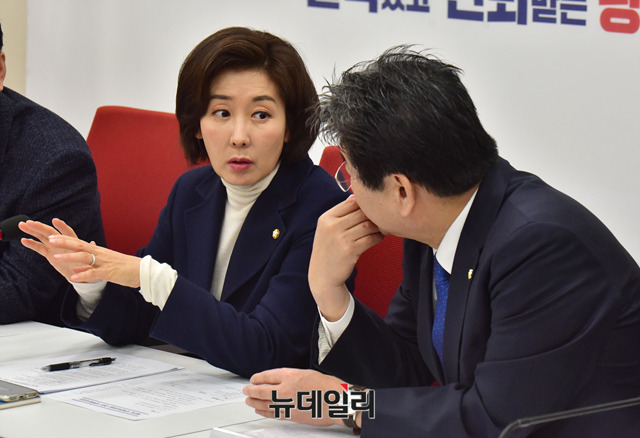 나경원 자유한국당 원내대표가 21일 오전 국회에서 열린 자유한국당 '제2차 미북정상회담 관련 대책회의'에 참석해 강석호 의원과 대화를 나누고 있다.