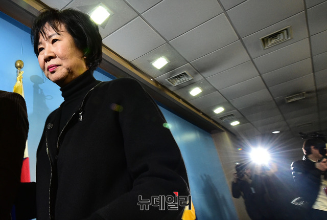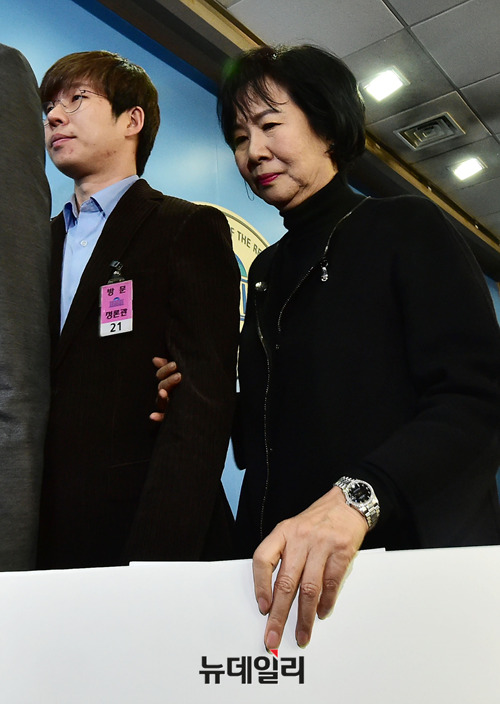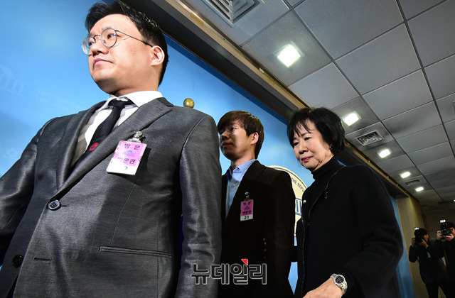 손혜원 무소속 의원과 여준형 젊은빙상인연대 대표, 박지훈 변호사가 21일 오전 국회 정론관에서 스포츠계 성폭력 사건관련 기자화견을 마치고 떠나고 있다.
