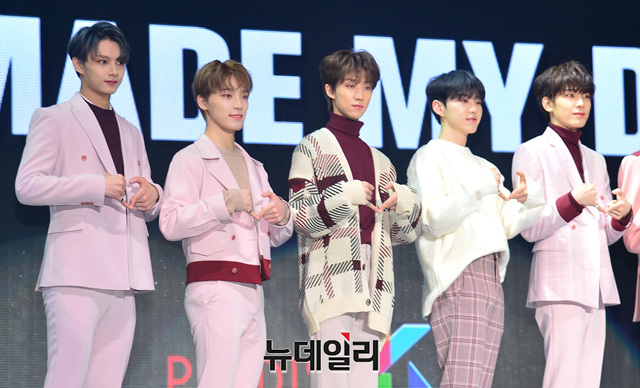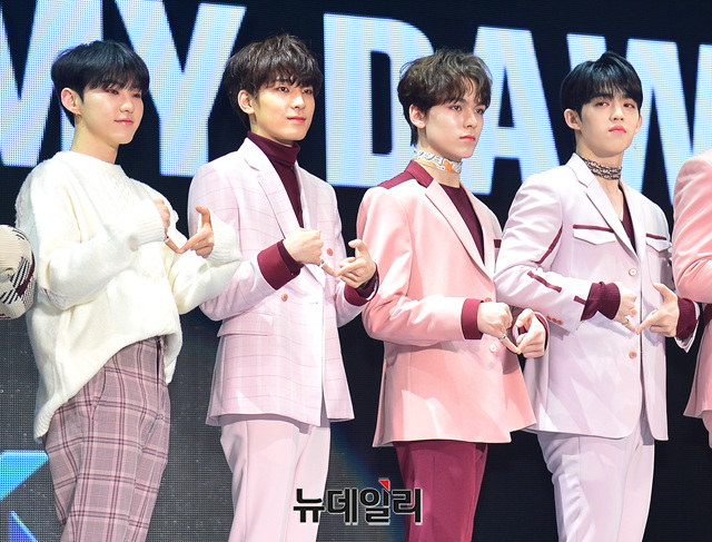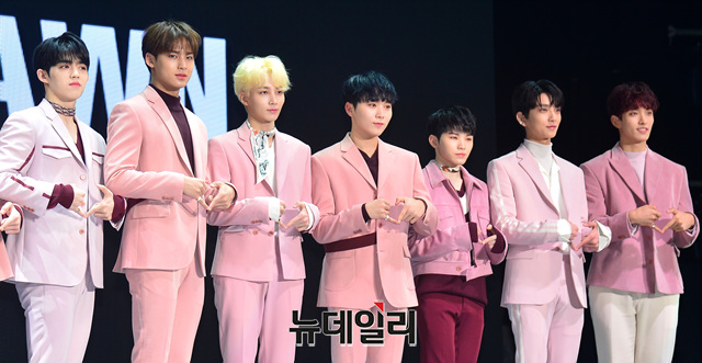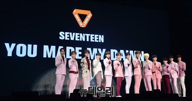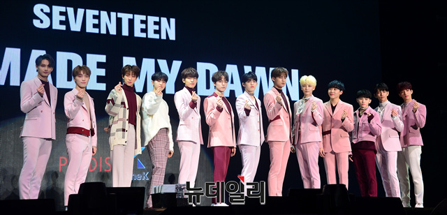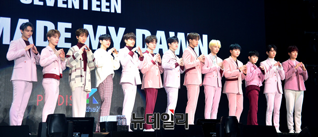 아이돌그룹 세븐틴이 21일 오후 서울 송파구 올림픽공원 올림픽홀에서 열린 쇼케이스에서 포토타임을 갖고 있다.