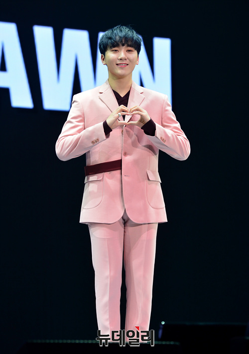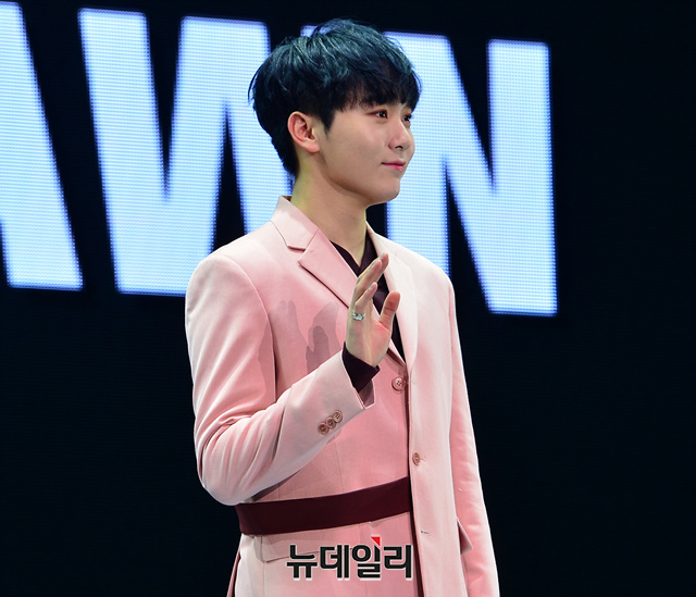 세븐틴의 승관이 21일 오후 서울 송파구 올림픽공원 올림픽홀에서 열린 쇼케이스에서 포토타임을 갖고 있다.