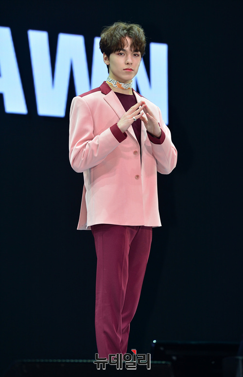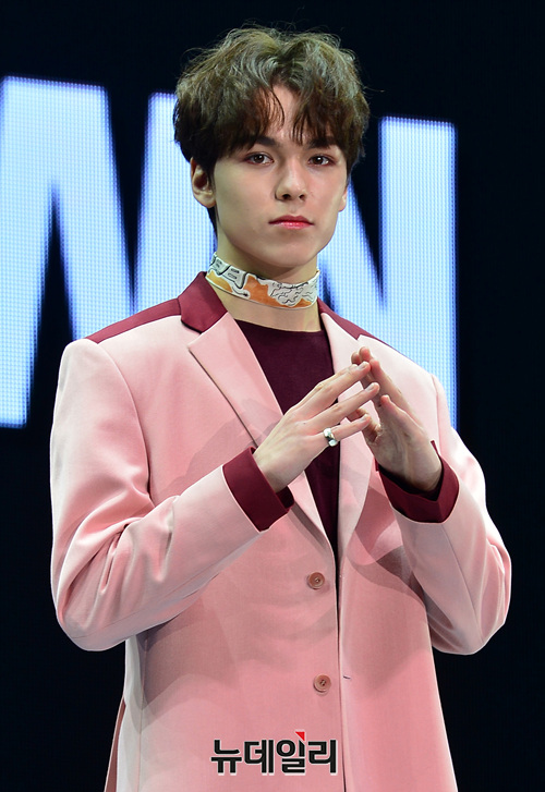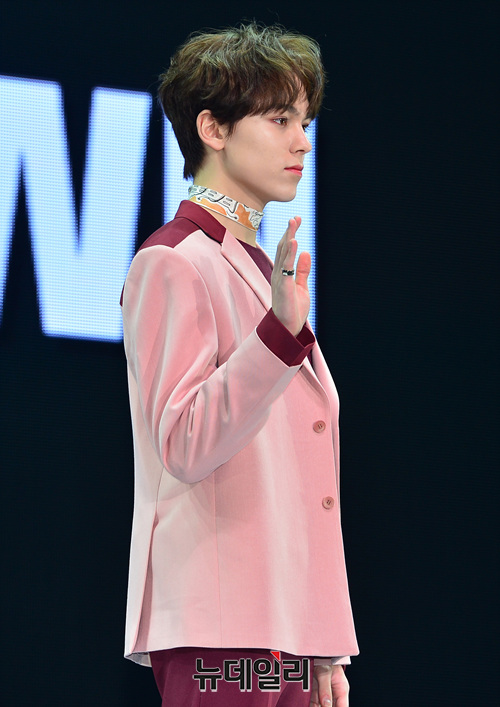 세븐틴 버논이 21일 오후 서울 송파구 올림픽공원 올림픽홀에서 열린 쇼케이스에서 포토타임을 갖고 있다.