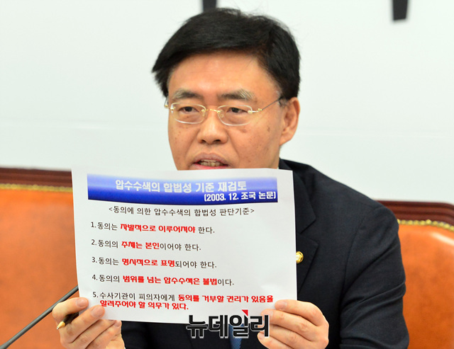 최교일 자유한국당 의원이 22일 오후 국회에서 열린 청와대 특별감찰반 진상조사단 회의에서 조국 민정수석의 논문의 일부를 보여주며 모두발언을 하고 있다.