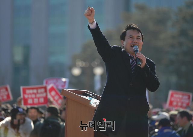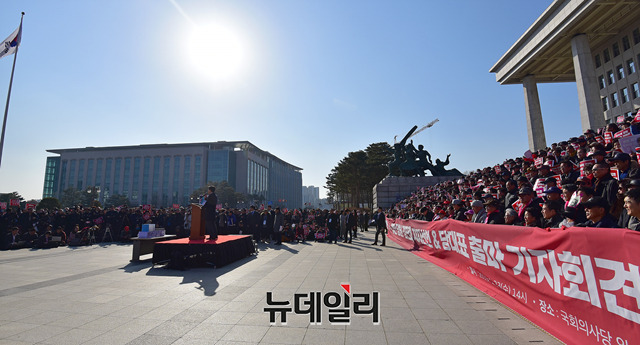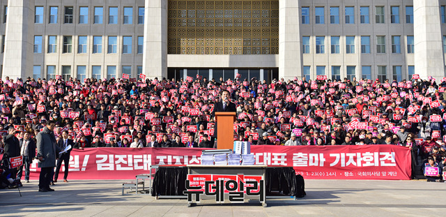 김진태 자유한국당 의원이 23일 오후 국회의사당 본청 계단에서 당대표 출마 선언을 하고 있다. 이날 출마 선언식에는 김 의원의 지지자들이 대거 참석해 본청 계단과 주변을 메웠다.