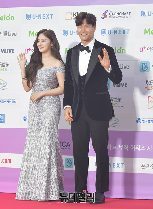 가수 김종국과 모모랜드 멤버 낸시가 23일 오후 서울 송파구 잠실 실내체육관에서 열린 '제8회 가온차트 뮤직 어워즈' 레드카펫 행사에서 포토타임을 갖고 있다.'가온차트 뮤직 어워즈'는 가온차트에서 집계한 데이터를 바탕으로 2018년 한 해 동안 활약한 음반(디지털 음원, 오프라인 앨범)과 아티스트에게 상을 수여한다. 올해는 팬덤간 과열 경쟁을 부추겨온 '팬 투표 인기상'을 폐지하고, 암표 발생을 최소화하기 위해 온라인 선예매 응모제를 도입했다.오후 7시부터 엠넷, 네이버 V LIVE, 일본은 U-NEXT를 통해 생중계 된다.