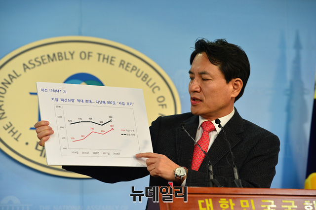 김진태 자유한국당 의원이 24일 오전 국회 정론관에서 기업 파산신청이 역대 최대라는 자료를 보여주며 기자회견을 갖고 있다.