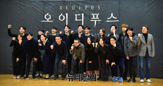 연극 '오이디푸스' 출연배우와 서재형 연출가가 24일 오후 서울 서초구 예술의전당 오페라연습실에서 공개행사에서 기념촬영을 하고 있다.