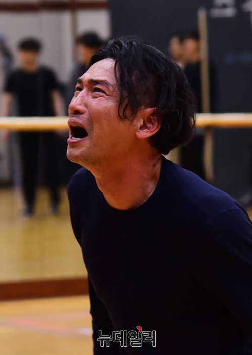 배우 황정민이 24일 오후 서울 서초구 예술의전당 오페라연습실에서 열린 연극 '오이디푸스' 연습실 공개행사에서 열연하고 있다.