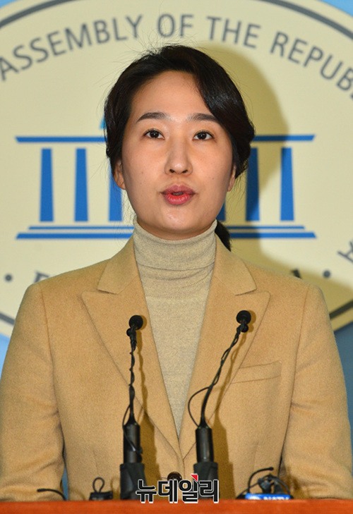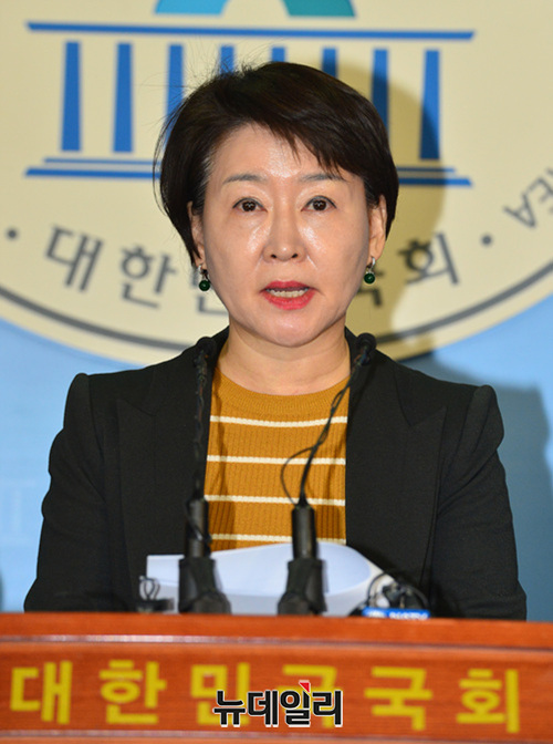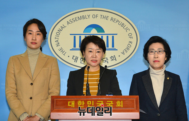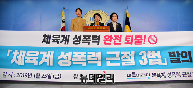 권은희 바른미래당 최고위원(왼쪽부터), 김수민 의원, 김삼화 의원이 25일 오전 국회 정론관에서 '체육계 성폭력 근절 3법 법안' 관련 기자회견을 갖고 '국민체육진흥법', '학교체육진흥법', '학원의 설립,운영 및 과외교습에 관한 법률(학원법)'의 개정 필요성을 밝혔다.