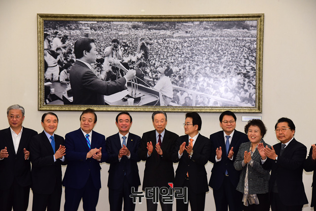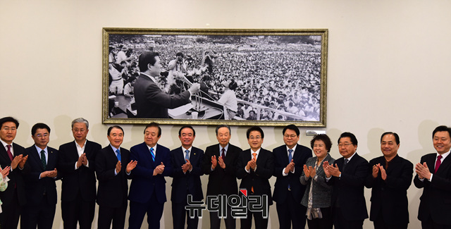 정동영 민주평화당 대표, 권노갑 고문, 정대철 고문과 민주평화당 의원들이 25일 오전 국회 민주평화당 회의실에서 故 김대중 전 대통령 사진액자 현판식에서 박수를 치고 있다.