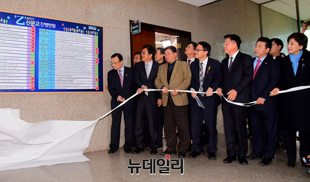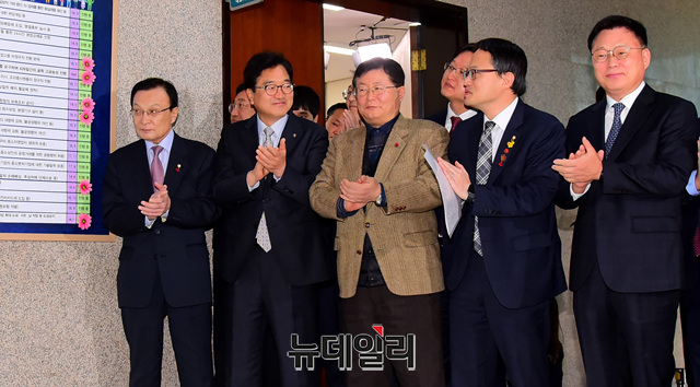 이해찬 더불어민주당 대표 및 의원들이 28일 오전 국회 당대표실 앞에서 을지로위원회 신문고 현판식을 하고 있다.
