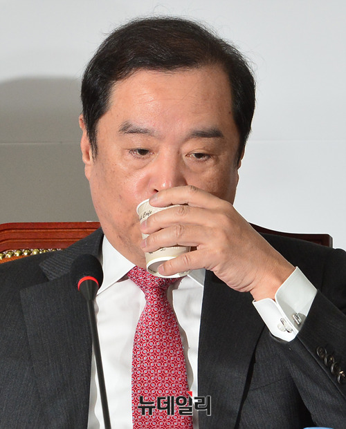 김병준 자유한국당 비상대책위원장이 28일 오전 국회에서 열린 비상대책위원회 회의에서 물을 마시고 있다.