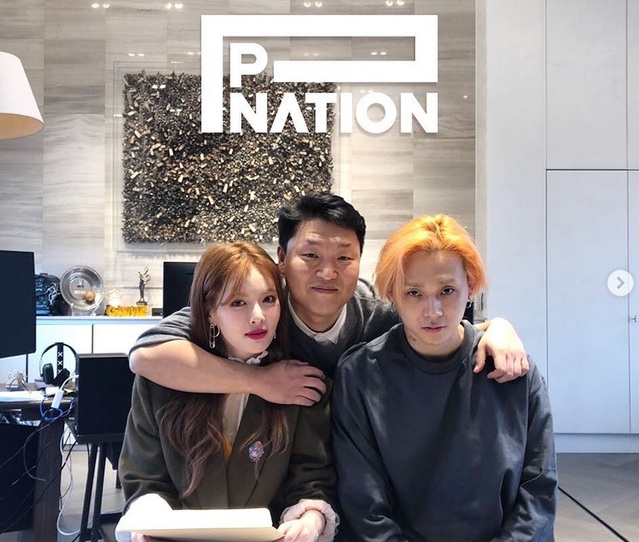 싸이는 27일 자신의 인스타그램에 가수 현아와 이던의 엄지손가락에 붉은색 인주가 묻은 사진과 더불어 활짝 웃는 얼굴로 두 사람의 어깨에 양팔을 두르고 있는 자신의 모습을 올렸다. ▲게시글에 적힌 'Welcome(웰컵)'이라는 태그와 ▲'간인'이 찍혀 있는 3~4장의 문서 ▲그리고 서류 봉투를 들고 있는 현아의 모습을 볼 때 두 사람이 이제 막 'P NATION(피 네이션)'과의 전속 계약서에 도장을 찍고 기념 사진을 찍은 것으로 추정되는 상황.