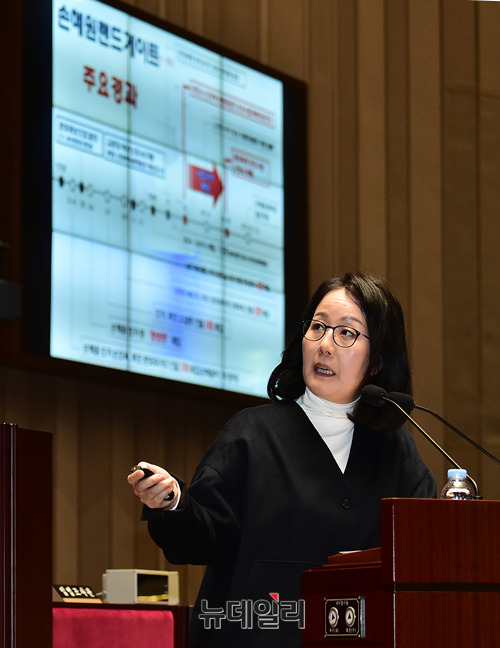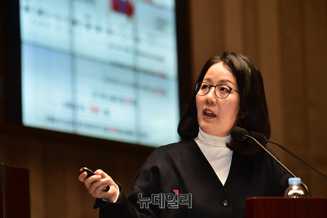 김현아 자유한국당 '손혜원 랜드게이트 TF'간사가 28일 오후 국회에서 열린 의원총회에 참석해 손 의원 관련 브리핑을 하고 있다.