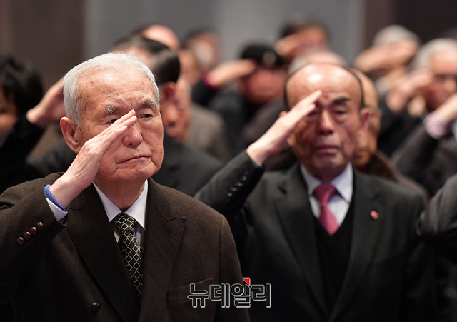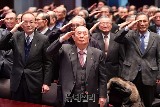 전직 군 장성, 전 국방부 장관 등이 30일 오후 서울 중구 한국프레스센터에서 열린 대한민국수호예비역장성단 출범식에 앞서 국민의례를 하고 있다. 이날 출범식은 오후 2시부터 비공개 총회를 거쳐 오후 5시까지 출범식을 진행할 예정이다.