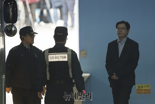 드루킹 김동원 씨와 공모해 댓글 조작을 벌인 혐의로 1심에서 징역 2년을 선고 받은 김경수 경남도지사가 30일 오후 서울 서초구 서울중앙지법에서 호송차로 향하고 있다.