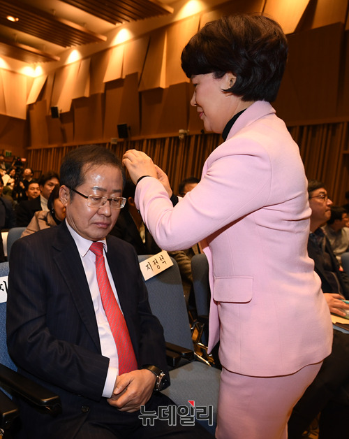 홍준표 전 자유한국당 대표가 30일 오후 서울 여의도 더케이타워에서 열린 '당랑의 꿈' 출판기념회에 참석한 가운데 부인 이순삼 여사가 홍 전 대표의 머리를 손질하고 있다.