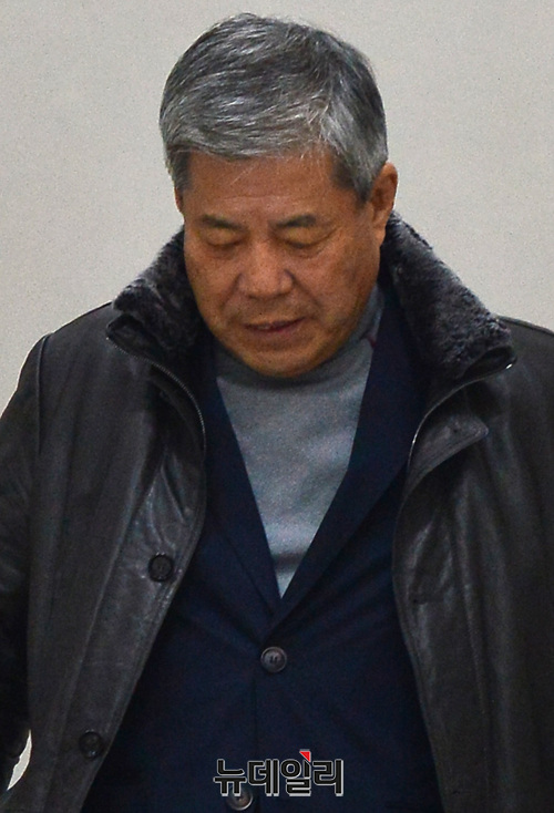 이명박 전 대통령의 증인으로 공판에 출석한 강경호 다스 사장이 30일 오후 서울 서초구 서울고등법원에서 증언 후 퇴장하고 있다.