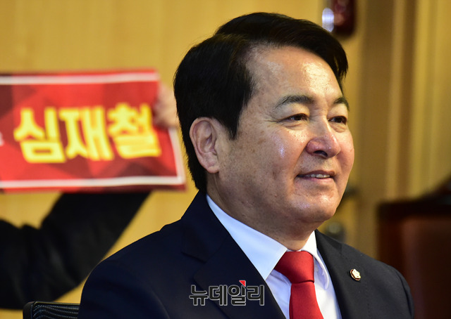 심재철 자유한국당 의원이 31일 오전 국회 의원회관에서 열린 당대표 출마선언에 앞서 순서를 기다리고 있다.