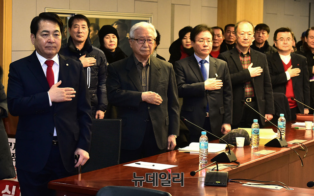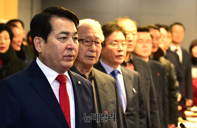 심재철 자유한국당 의원이 31일 오전 국회 의원회관에서 열린 당대표 출마선언에 앞서 국민의례를 하고 있다.