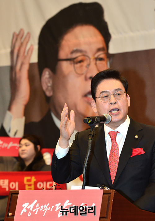 [포토] 3합 외치며 당대표 출마선언 하는 정우택