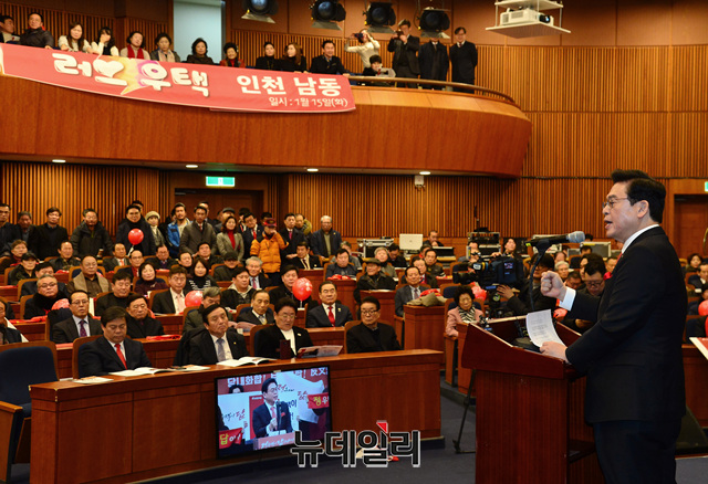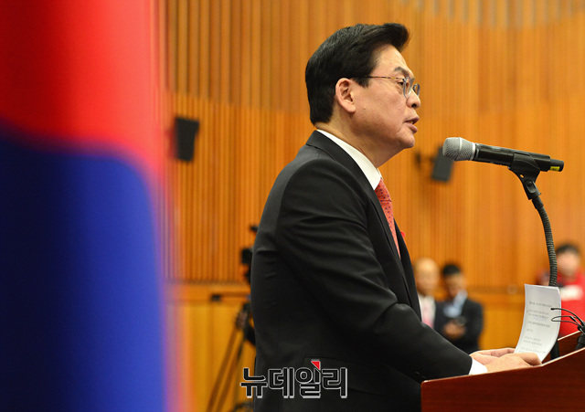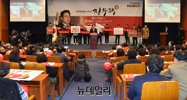 정우택 자유한국당 의원이 31일 오전 국회 헌정기념관에서 화합, 통합, 연합(3합)을 외치며 당대표 출마선언을 하고 있다.