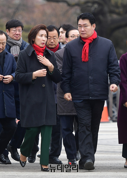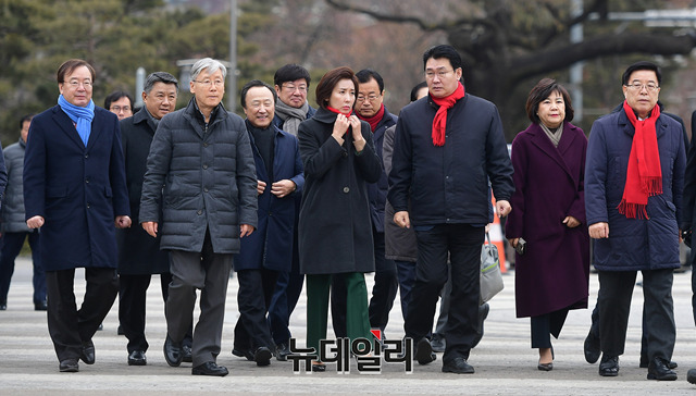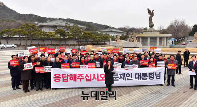 나경원 자유한국당 원내대표, 정용기 정책위의장을 비롯한 의원들이 31일 오전 서울 종로구 청와대 앞 분수대에서 긴급의총에 입장하고 있다. 이날 한국당은 "응답해주십시오! 문재인대통령님"이라고 적힌 현수막을 펼쳤다.의원들은 "창성장은 누구겁니까", "김태우특검 신재민청문회 즉각 실시하라", "캠프인사 대선공신 조해주는 사퇴하라", "정치편향 선관위원 부정선거 획책이다", "드루킹 여론조작 청와대는 사죄하라", "대통령딸! 해외이주 진상을 규명하라", "손혜원 비리게이트 국조·특검 수용하라"등의 손피켓을 들고 참석했다.