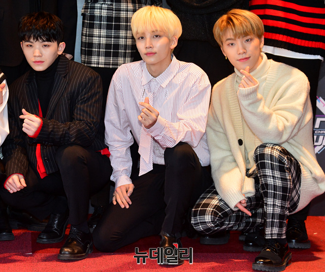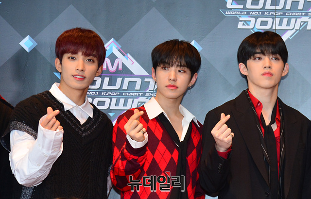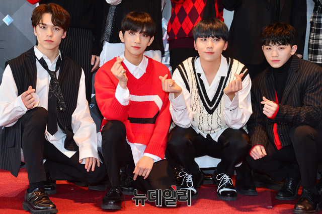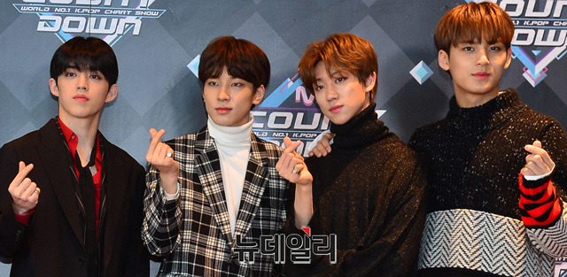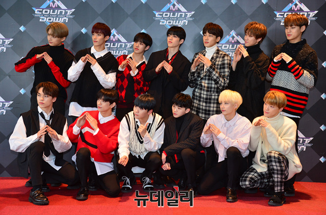 아이돌 세븐틴이 31일 오후 서울 마포구 CJ E&M센터에서 열리는 '엠카운트다운' 생방송을 위해 입장하며 포토타임을 갖고 있다.