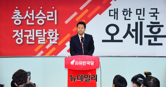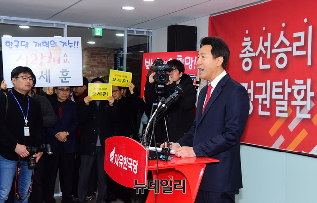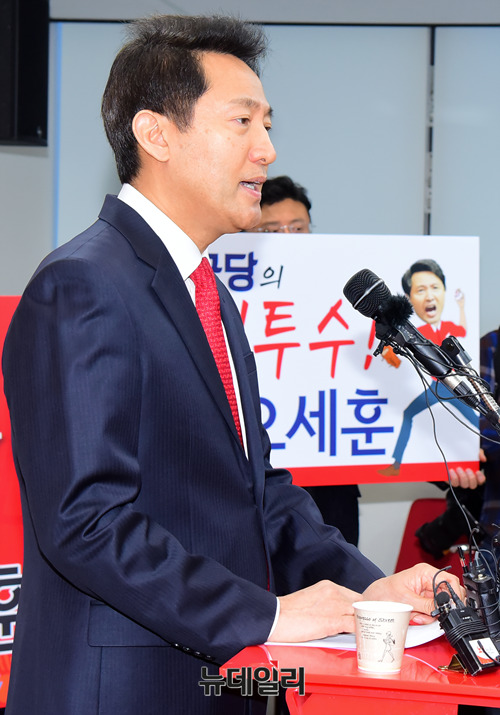 오세훈 전 서울시장이 7일 오전 서울 영등포구 자유한국당 중앙당사에서 당 대표 출마선언 후 기자들의 질문에 대답하고 있다.