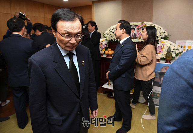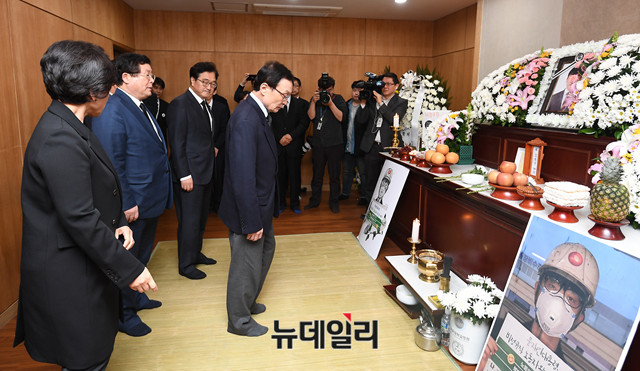 이해찬 더불어민주당 대표가 7일 오후 서울 종로구 서울대학교병원 장례식장에 마련된 태안 화력발전소 피해자 고 김용균 씨의 빈소를 찾아 조문을 하고 있다.